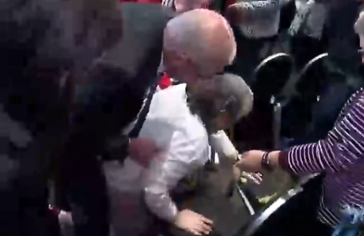 முட்டை வீசிய இளம் பெண் ஓடும் போதும் பாதுகாப்பு அதிகாரிகளால் மடக்கி பிடிக்கும் முயற்சியில் வயோதிப் பெண் ஒருவர் கீழே விழுந்துள்ளார்.